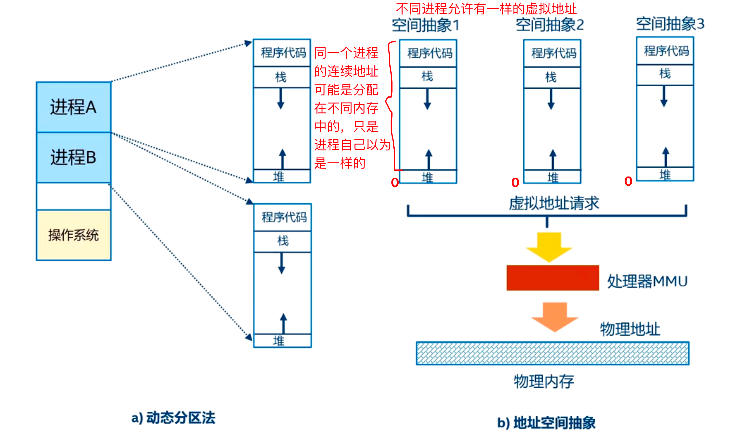 - 虚拟地址空间:每个进程独立的地址视图。两个进程可以使用相同的虚拟地址,但它们映射到不同的物理内存区域。