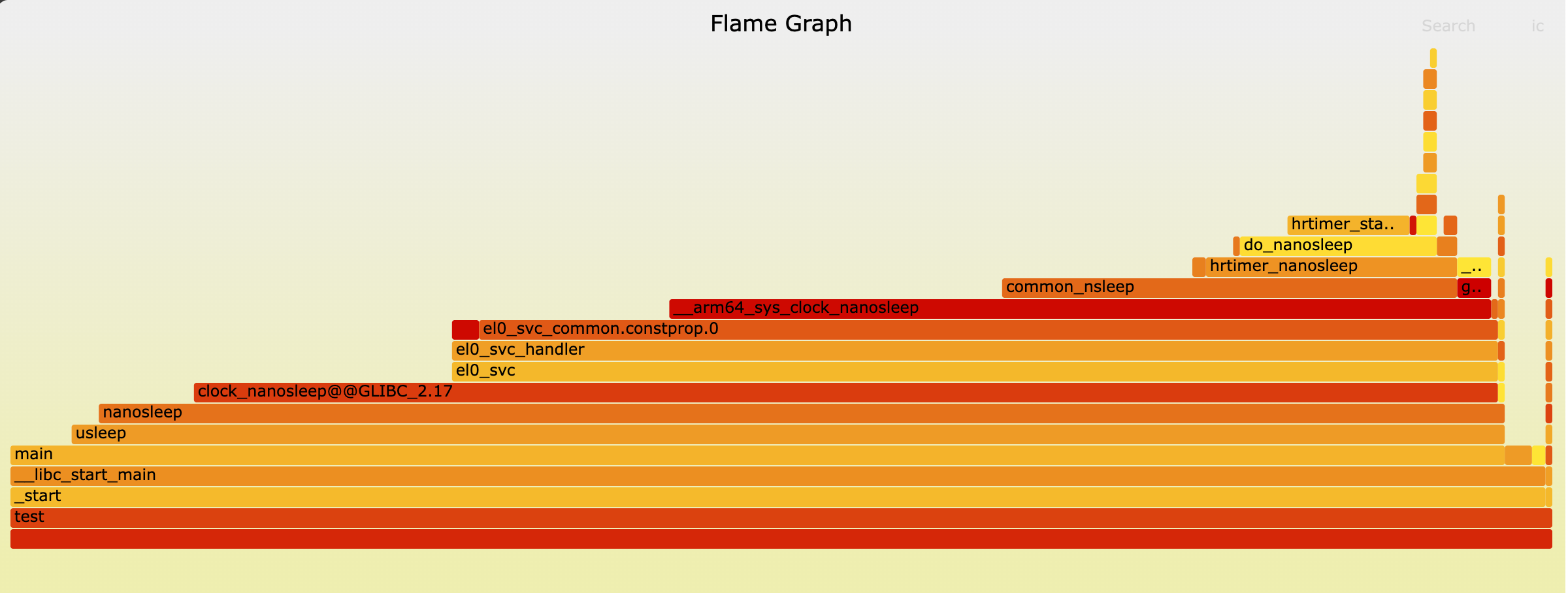 - usleep 最终导致了 nanosleep 或类似的系统调用,例如 hrtimer_nanosleep 和 do_nanosleep,这些调用在图中形成了最宽的“火焰尖”。