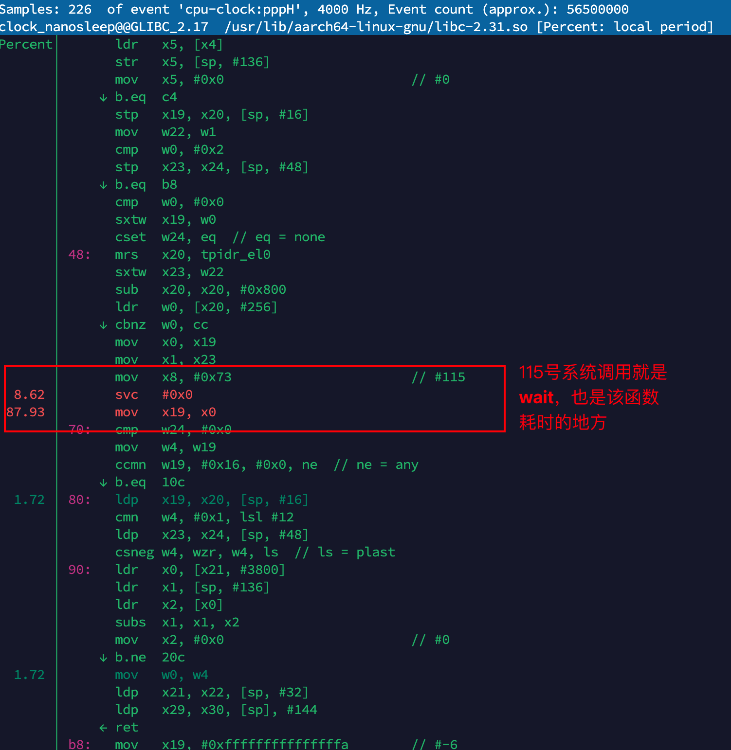 这个符号表示内核调用 __arm64_sys_clock_nanosleep,也就是说内核在处理 clock_nanosleep 系统调用时占用了 13.68% 的 CPU 时间。