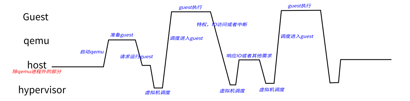 从这个图上我们可以看到,除了掌握更多的资源(IO资源),Host的地位和Guest地位几乎是对等的。这造成一个很有趣的现象:如果我们在host上用top来看进程的CPU的占用率,Guest占掉的CPU是算在qemu头上的,因为从时间上来说,host确实看到CPU进入qemu后,就没有出来了。但如果用perf top来看,你却看不见qemu占用CPU,因为PMU的中断打进来后,如果调度到Guest中,Host是看不到这个打的点的。所以perf top的报告是qemu占用并不高。