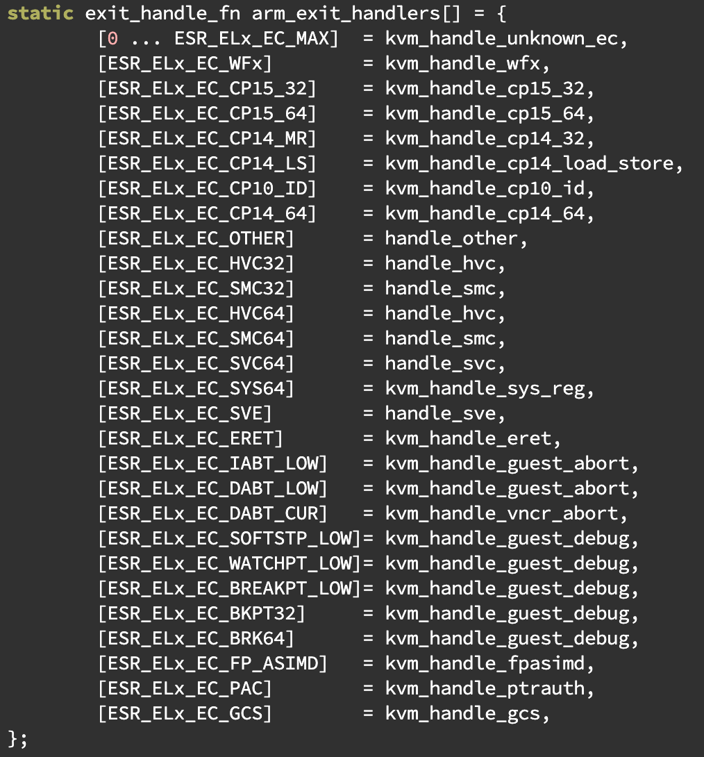源码arch/arm64/kvm/handle_exit.c中有与各ESR对应的异常处理函数表: