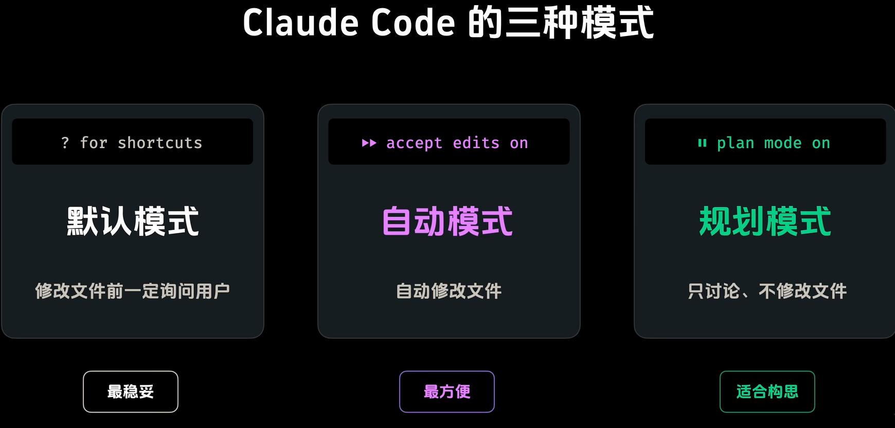claude中有三种模式,用shift + tab可以切换,这三种模式如下所示: