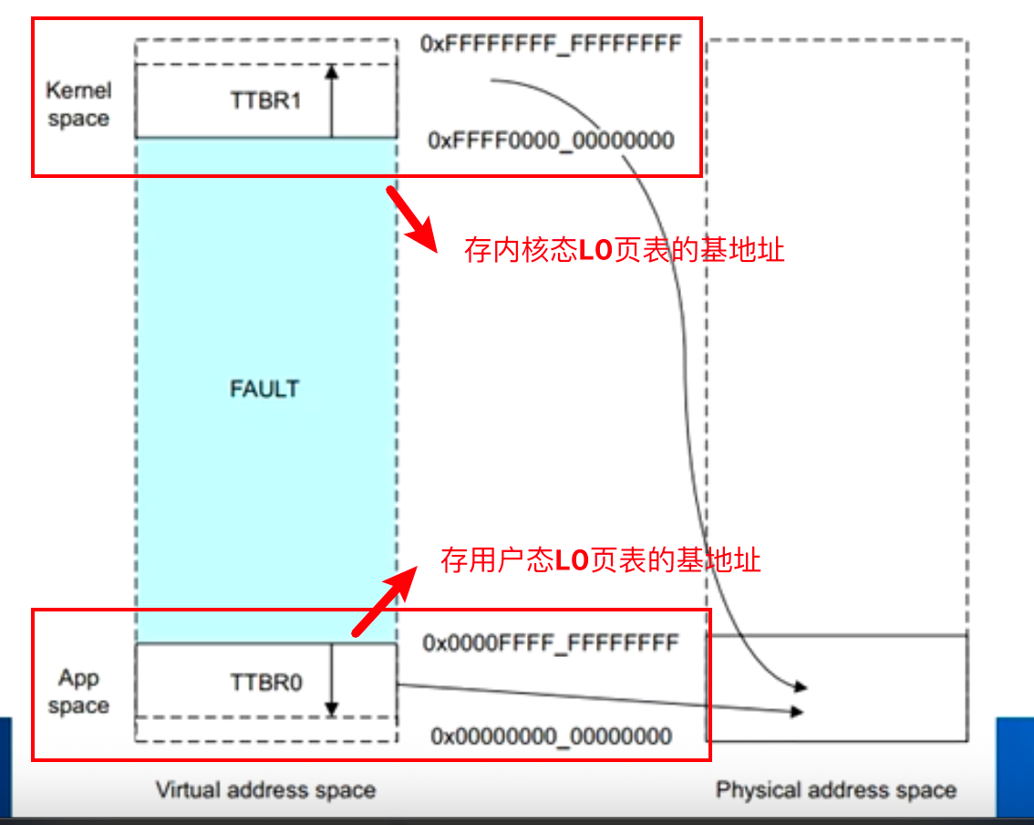 其中,TTBR0 通常用于用户空间地址转换,TTBR1 用于内核空间地址转换。为了实现用户态和内核态进程的隔离,保证内核空间不被用户空间访问,因此可以看到我们总线有 64 bit,但实际上用户空间和内核空间的地址范围都被限制在 48 bit 内,原因是这样就可以通过 TTBR0 和 TTBR1 分别指向不同的页表来实现用户空间和内核空间的地址转换。