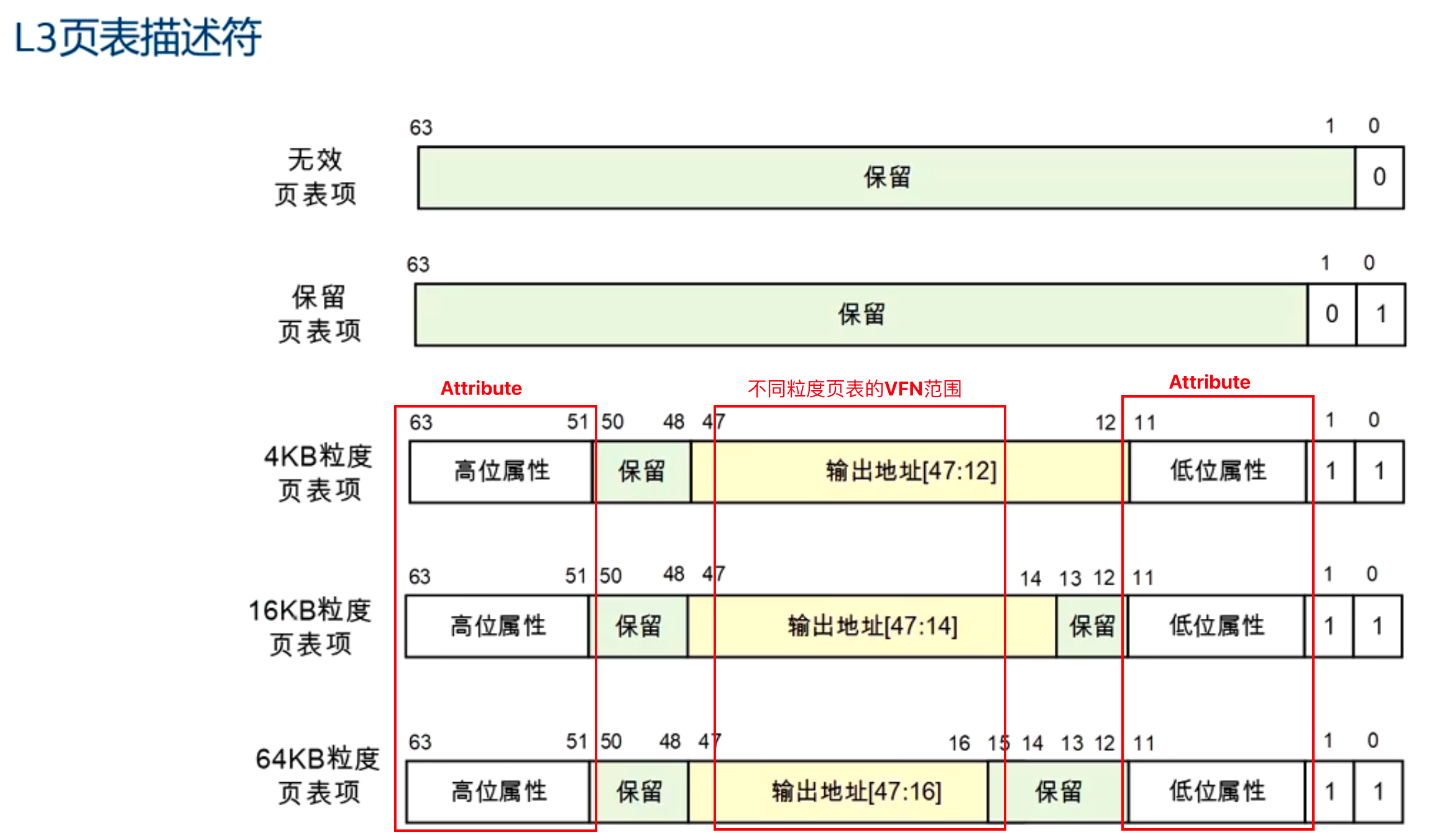 - 64KB粒度页表项:表示该页表项映射一个64KB的页