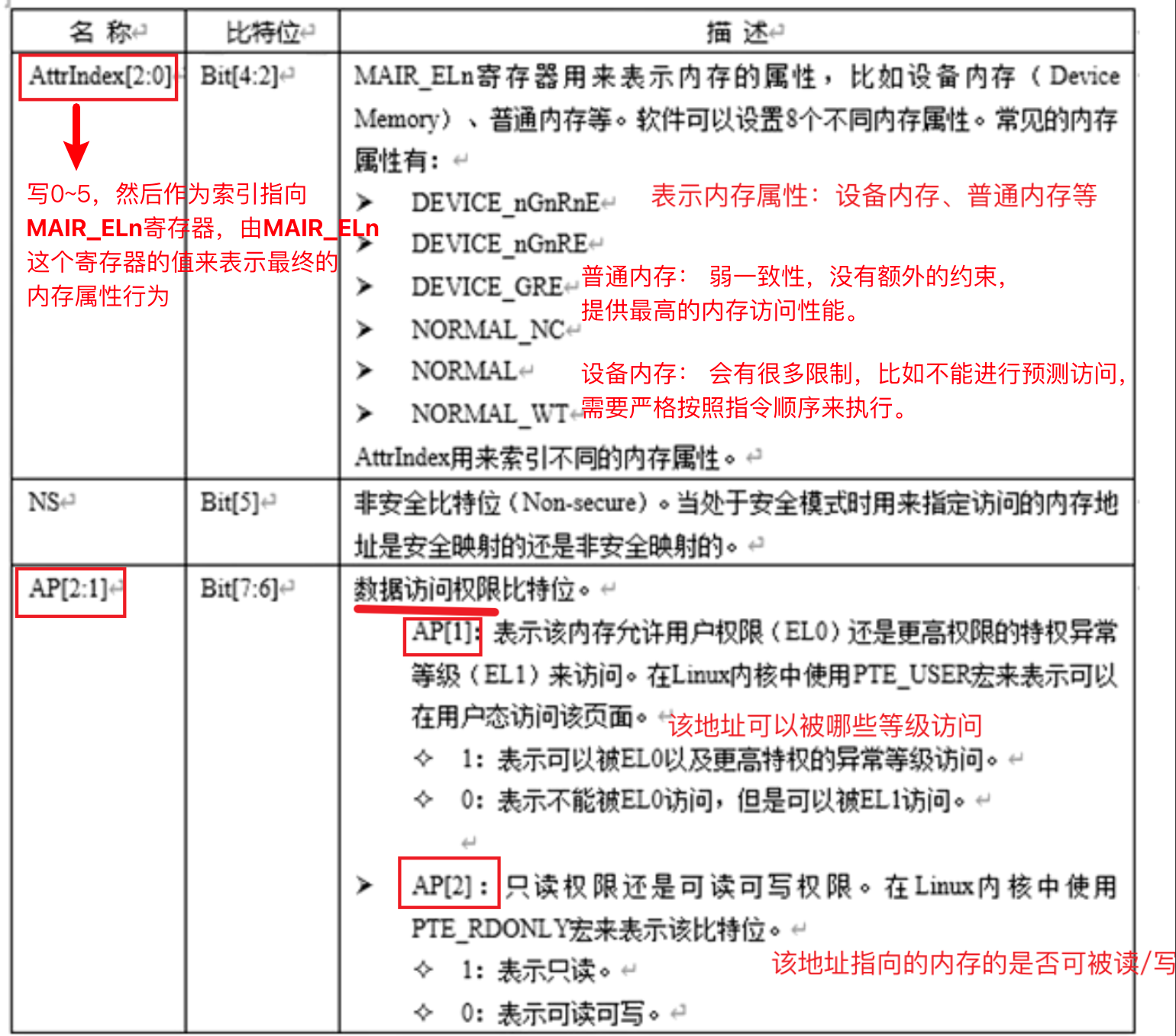 页表属性包含了该 entry 的读写权限位、访问位、脏位、内存属性位等信息,stage1的一些典型页表属性如下: